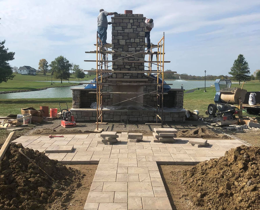 A RECENT OUTDOOR FIREPLACE, PAVER PATIO, FREESTANDING SEATING WALLS, LANDSCAPING, AND LANDSCAPE LIGHTING INSTALLATION PROJECT FROM START TO FINISHED